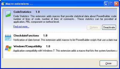 Un simple clic droit sur la barre de navigation vous permet d’ajouter des extensions de macros. Vous pouvez choisir la ou les macro(s) dont vous avez besoin et ainsi personnaliser l’interface graphique de Visual Expert sans vous encombrer de macros que vous n’utilisez que très rarement. Les extensions Code Statistics, Check Date Funcitons et Windows 7 ont déjà été publiées. Cette liste va continuer de s’agrandir.